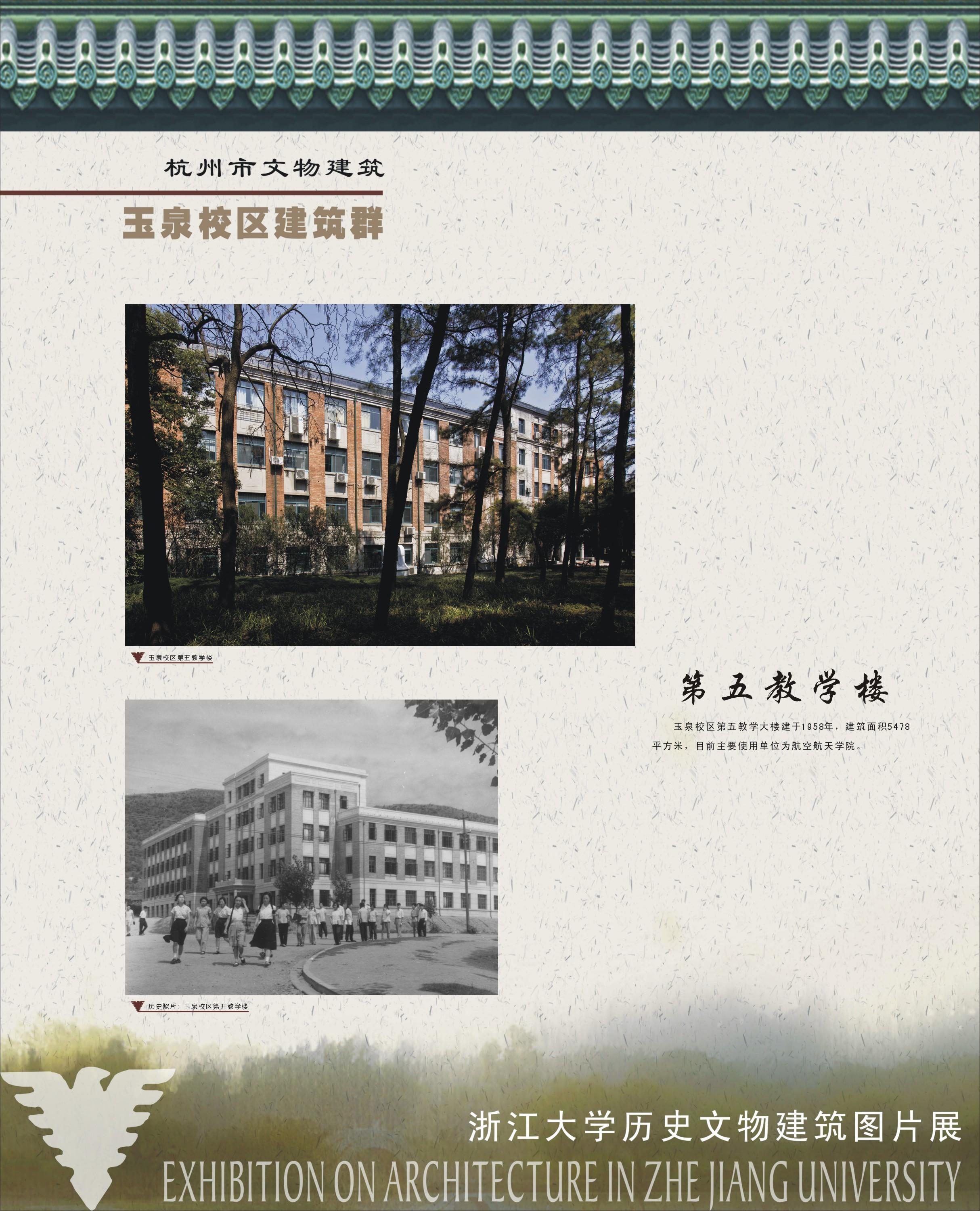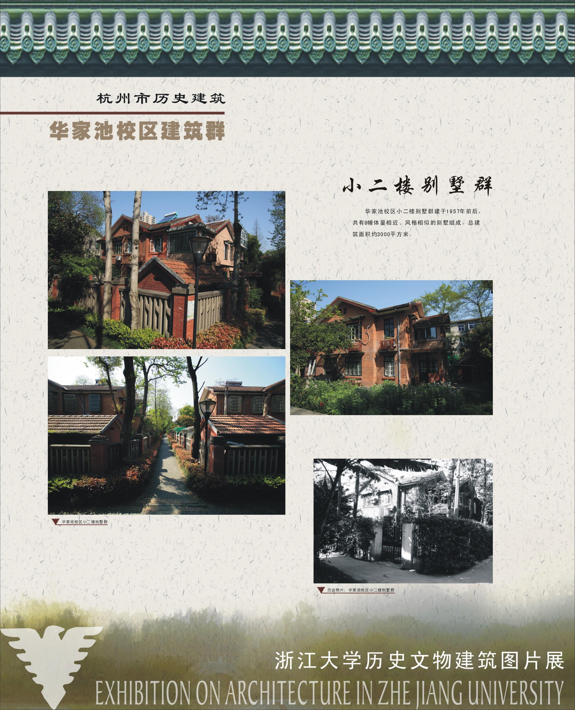 “浙江大学历史文物建筑图片展”由三部分组成:第一部分为全国重点文物保护单位——之江大学旧址,展示之江大学时期的22幢文物建筑;第二部分为杭州市历史文物建筑,展示玉泉校区10幢市级文物建筑,西溪校区、华家池校区、杭大新村共20余幢杭州市历史建筑;第三部分为浙江大学第一次全国可移动文物普查工作简介。