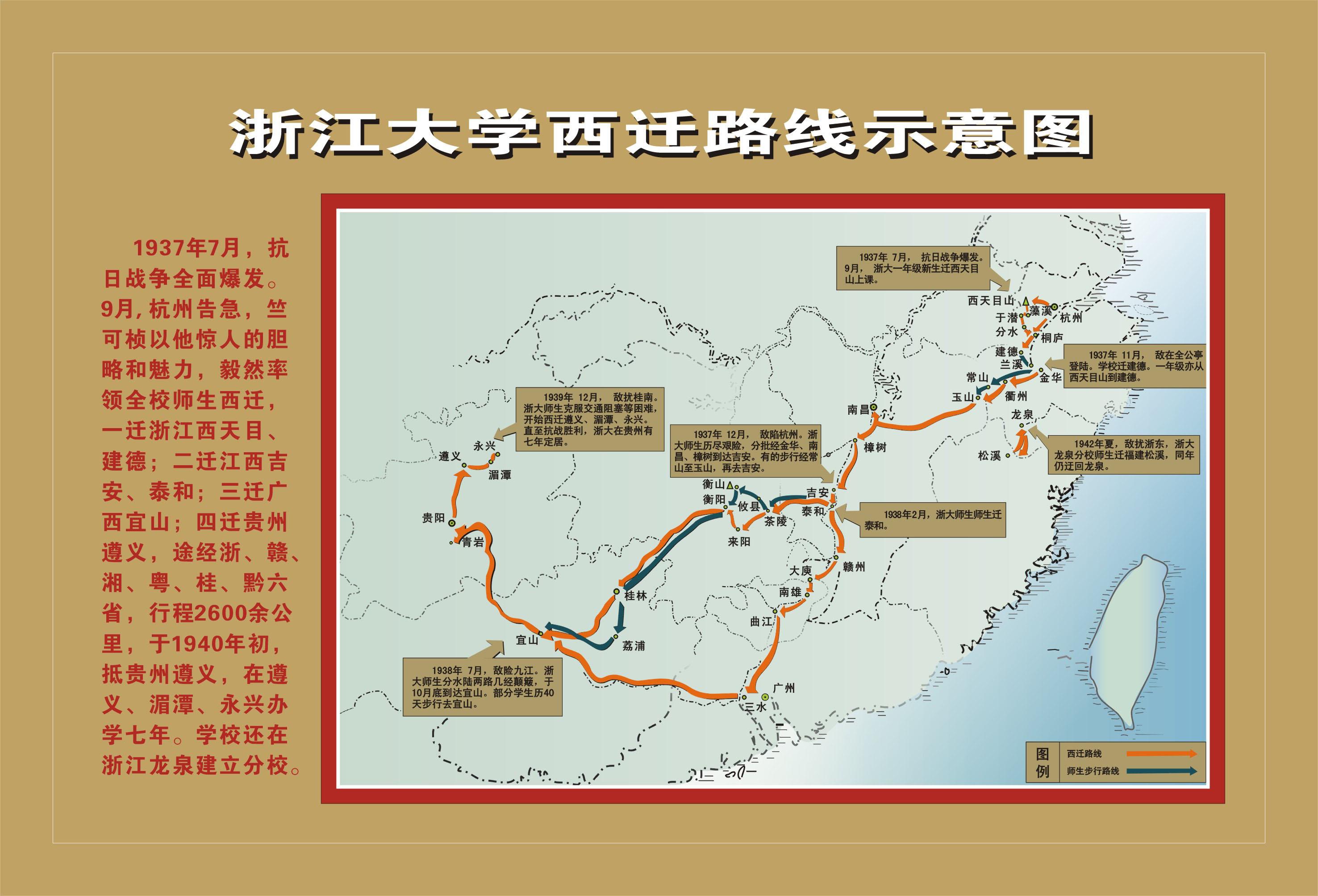 1937年“七七事变”后,抗日战争全面爆发。面对日本侵略军的大规模军事进攻和对中国高等教育的蓄意破坏,我国高等学校为救亡图存,保存民族元气,开始了艰苦卓绝的西迁历程,谱写了一部可歌可泣的高校西迁史。在这场历时数年,涉及我国绝大部分高校的西迁运动中,浙江大学面对恶劣的环境,在竺可桢校长的卓越领导和西迁途中各地民众的大力支持下,艰苦奋斗、求是创新,成为在艰难困苦中崛起的“东方剑桥”,为中国抗日战争的胜利作出了特殊贡献。